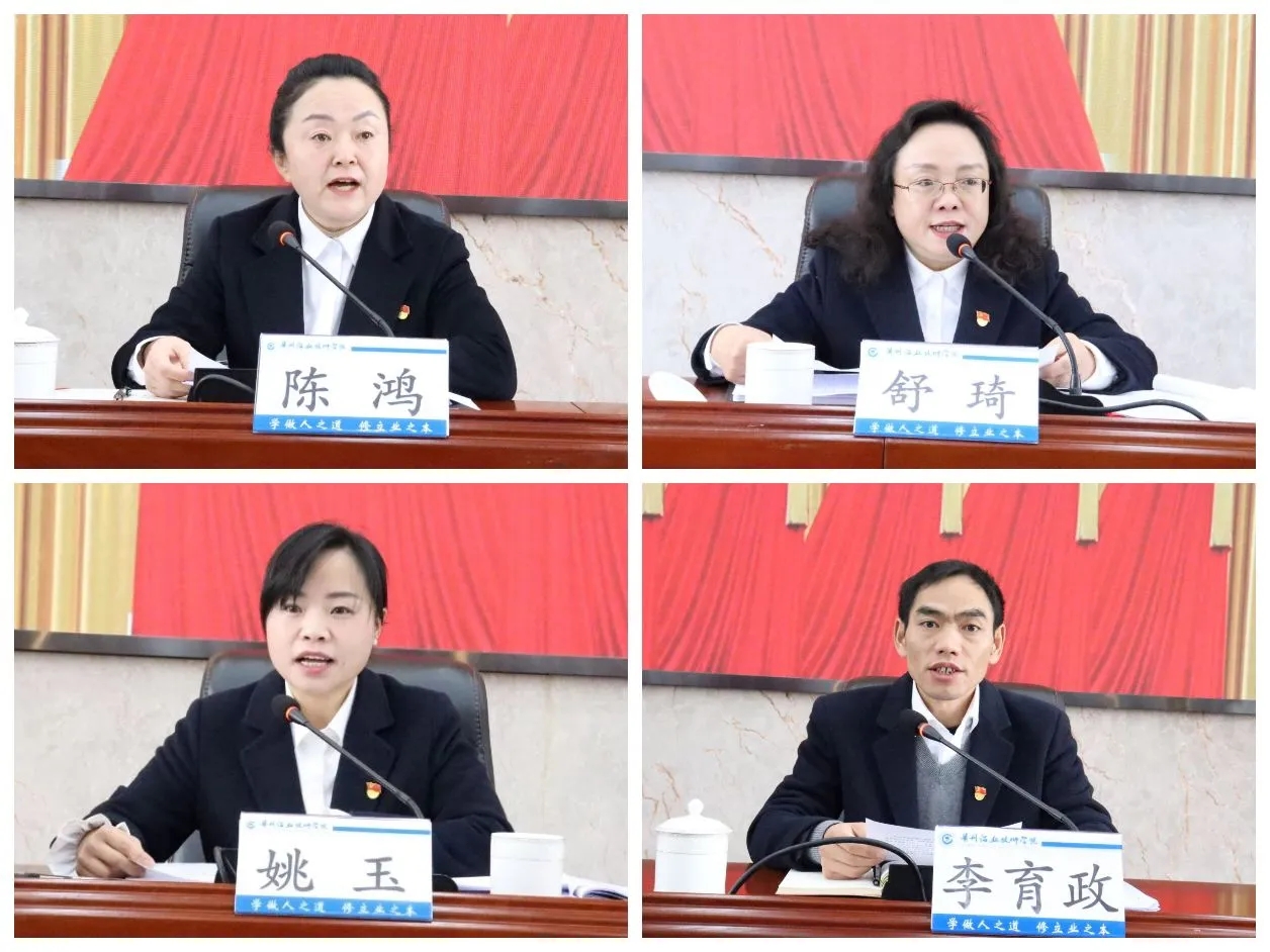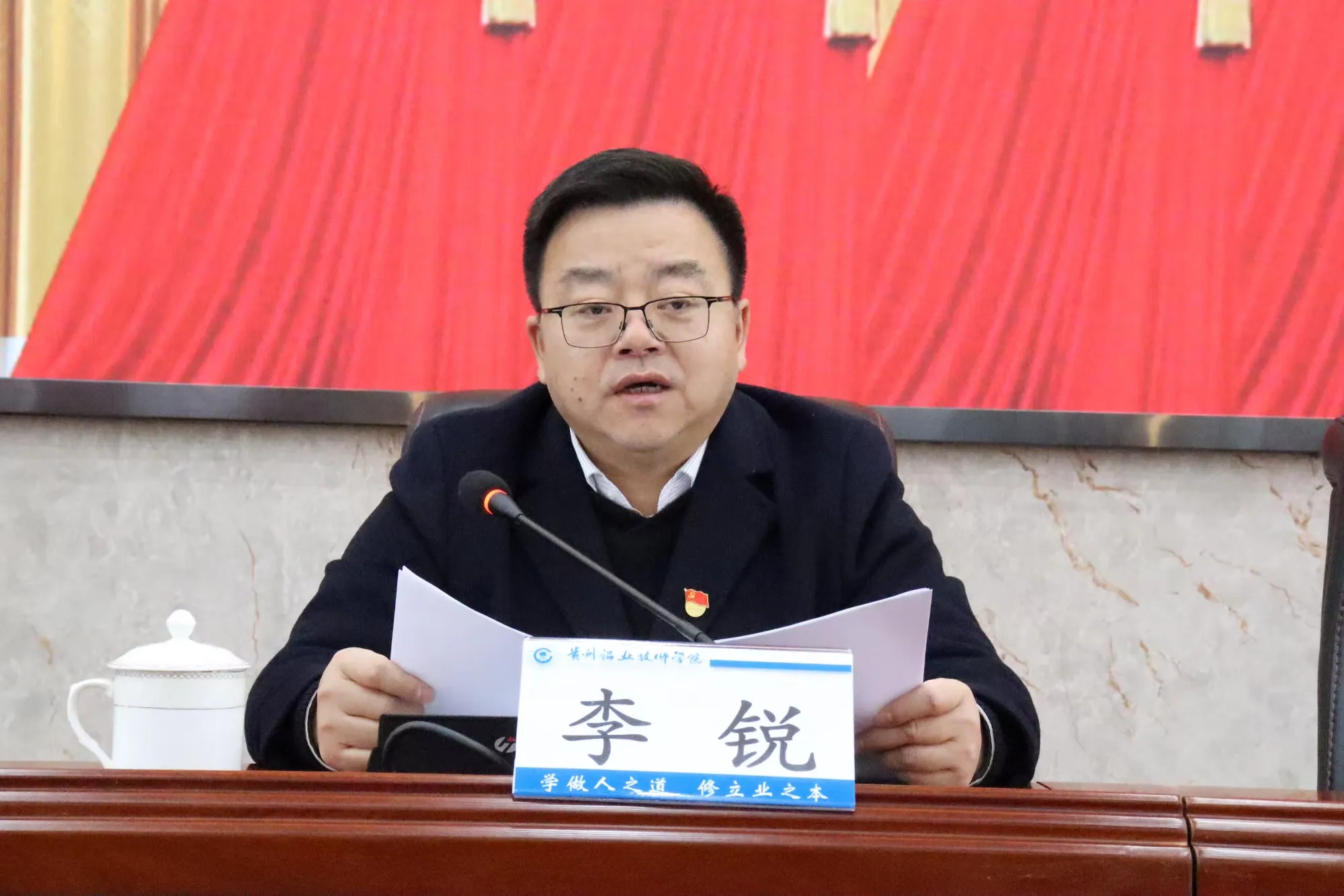 学院党委书记李锐传达学习了贵州铝厂党委书记何飞在二届四次职代会上作的工作报告及会议精神。并作了题为《守正创新促发展,砥砺前行启新程:以奋进之笔续写学院高质量发展新篇章》的工作报告。报告围绕2024年学院“11235”工作思路 :围绕“一个目标”、打造“一个基地”、突出“两项重点”、抓实“三大工程”、把握“五个关键”,从四个坚持:坚持优化招生就业,扩大“社会化”办学影响;坚持政策项目争取,助力“品牌化”校园建设;坚持拓展业务培训,突出“市场化”培训成果;坚持校园文化浸润,抓实“军事化”学生管理。四个巩固:巩固“一体化”教学成果,激发教育新活力;巩固“技能型”人才培养,实现大赛新突破;巩固“全方位”安全管理,校园安全有保障;巩固“党建+”阵地建设,主推发展高质量等方面进行了全面总结回顾,对工作中存在的问题和不足进行了分析和梳理,同时对2025年工作从加大招生、促进就业,突出办学影响创一流;拓展领域、扩大地域,提升“培训质量”创一流;文化育人、军事管理,抓实“学生管理”创一流;培养师资、注重实训,优化“育人模式”创一流;关心青年、锤炼青年,确保“人才培养”创一流;用好政策、争取资金,规范“资金使用”创一流;肩负责任、筑牢防线,抓实“安全管理”创一流;牢记使命、聚焦党建,强化“党建引领”创一流八个方面进行全面的安排和部署。